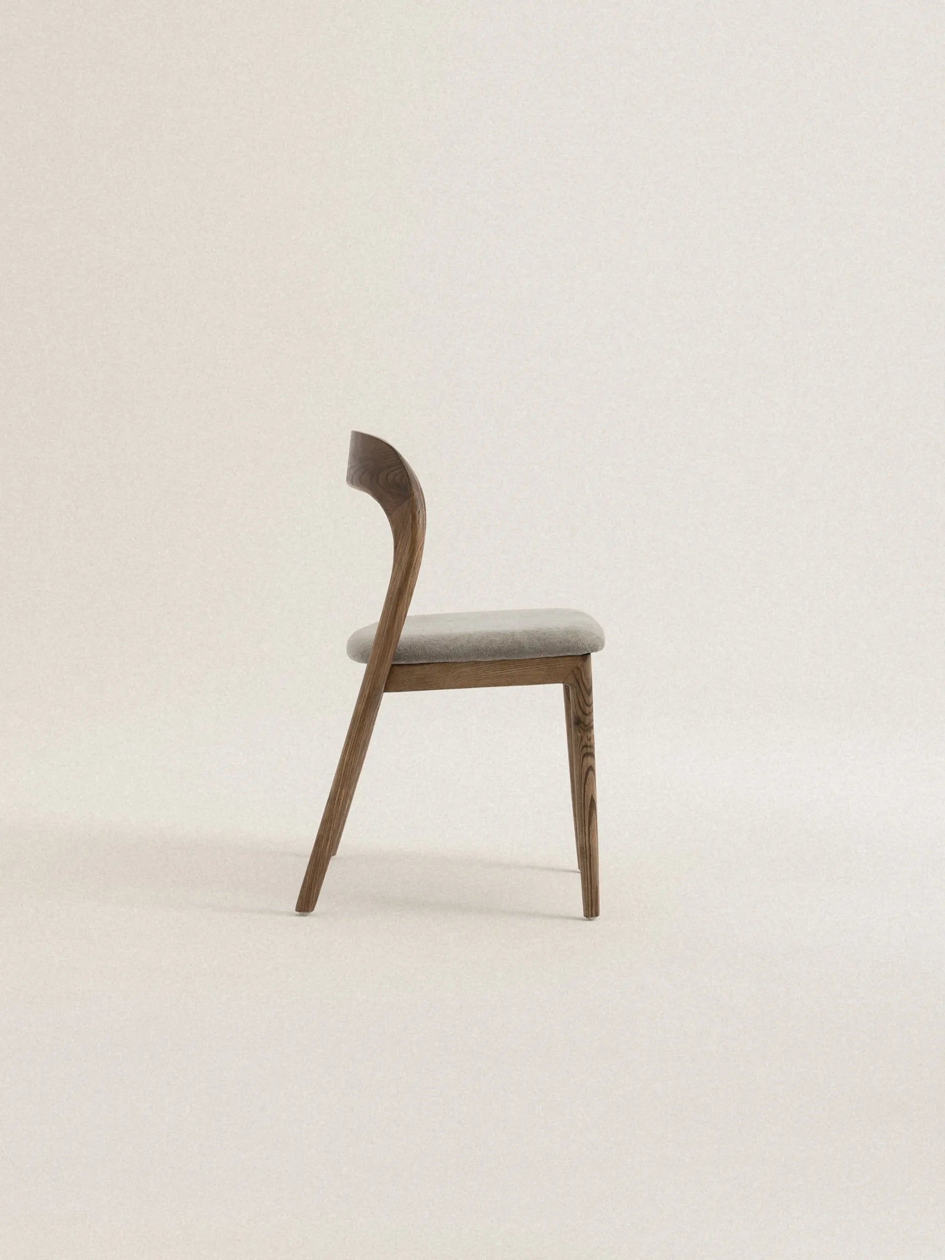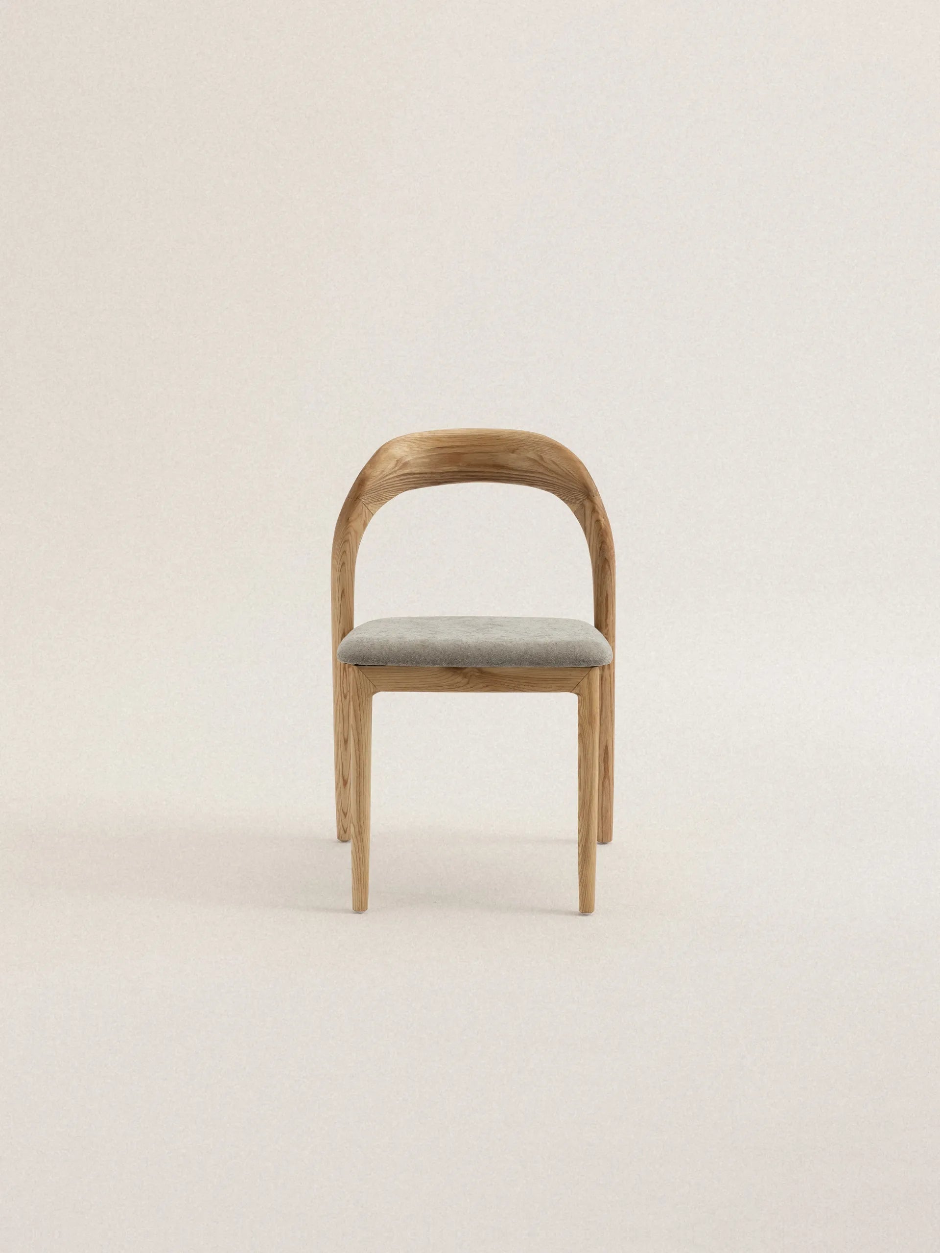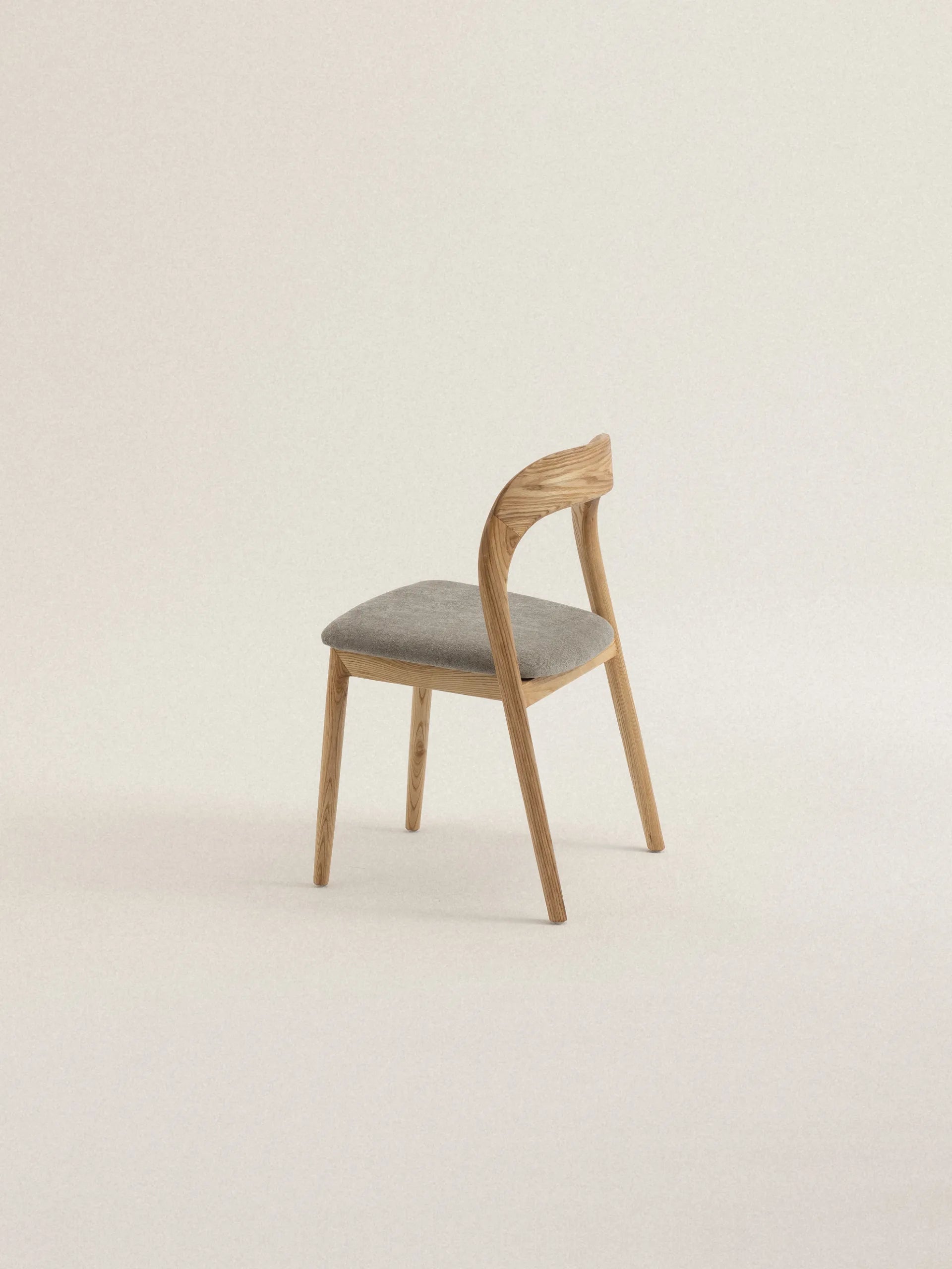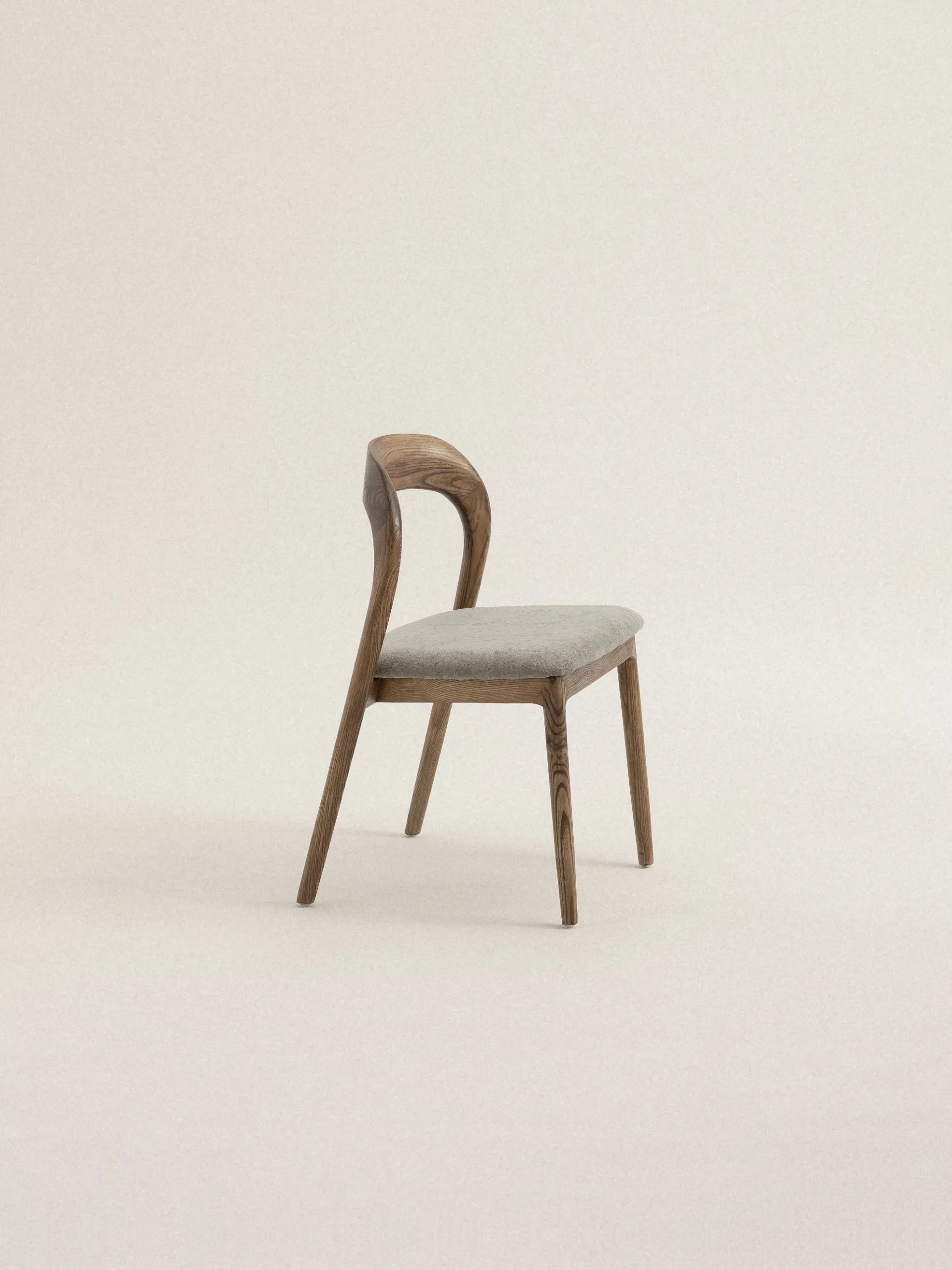 Lenta to krzesło, które mówi językiem płynnych linii i naturalnego ciepła. Drewniana rama o organicznej formie otula miękkie, tapicerowane siedzisko, tworząc harmonię między strukturą a komfortem. Każda zakrzywiona linia wydaje się być wyrzeźbiona z myślą o ciele, które ma w niej spocząć – ergonomia spotyka się tutaj z poetyką formy.